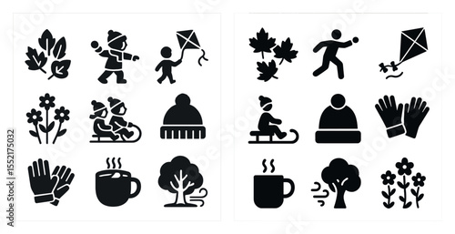 Fototapeta premium Winter activities silhouette icons set – solid, filled, cold season symbols