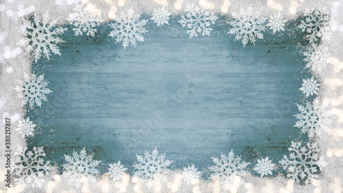 Fototapeta premium Winter / Advent / Christmas / holiday Background template - Frame made of snow with snowflakes, ice crystals and sparkles bokeh lights on blue turquoise wooden texture, top view with space for text