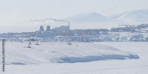 Fototapeta premium Winter Arctic landscape. View of the northern city. Anadyr, Chukotka, Russia....