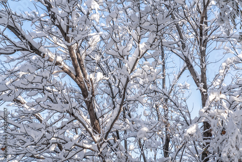 © Sondem, Fototapeta premium Winter background, close up of frosted pine branch on a snowing day