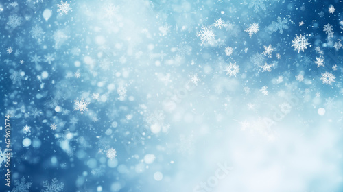 © Mariia, Fototapeta premium Winter background, falling beautiful snowflakes, selective focus. Falling snow and snowflakes close-up on a blue background