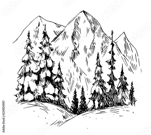 © aksol, Naklejka premium Winter background with mountains, snow and trees. Hand drawn illustration converted to vector.