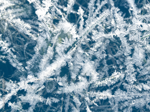 © Anastasia Tsarskaya, Fototapeta premium winter background with snowflakes crystals patterns and snow on frozen grass