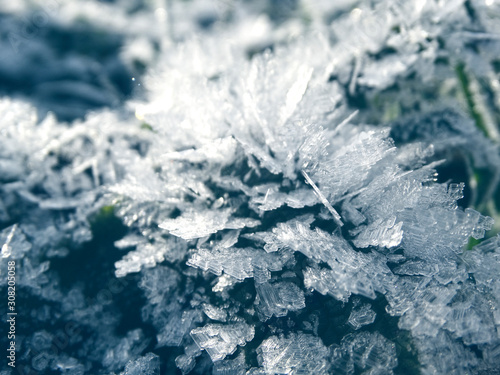 © Anastasia Tsarskaya, Fototapeta premium winter background with snowflakes crystals patterns and snow on frozen grass