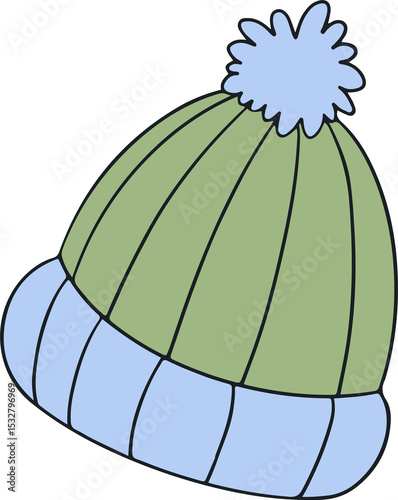 Naklejka premium Winter beanie is showing flat design with ribbed knit, folded cuff, pom-pom,...