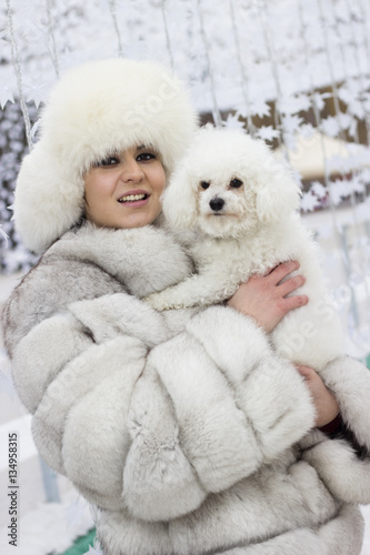 Fototapeta premium Winter beauty. Smiling young woman in the wintertime with her dog. Woman wearing white winter fur coat while holding her dog. Christmas decorations in the background.