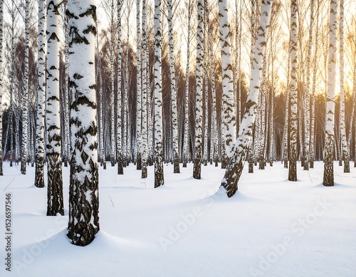 © Luthfi, Fototapeta premium Winter birch forest bathed in golden sunlight