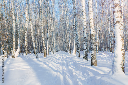 Fototapeta premium Winter birch forest lit by the sun at sunset