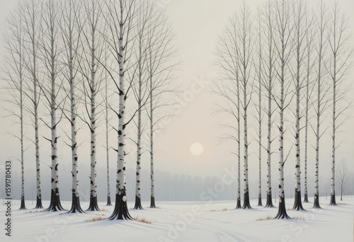 Naklejka premium Winter Birches A minimalist painting of bare silver birch trees in a snowy landscape, evokes winter s tranquility and subtle