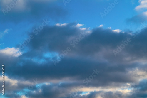 © Trik, Fototapeta premium Winter blue sky and cloud. Calm clear winter air background. The sky blue texture clouds. Blue sky and White cloud nature background.