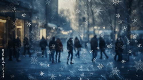 Obraz premium winter blurred background, snowflakes, people crowd, pedestrian street in...