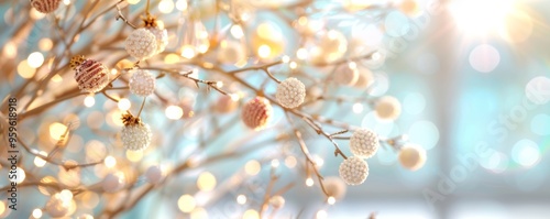 Fototapeta premium Winter branches adorned with soft lights and textured ornaments, creating a...
