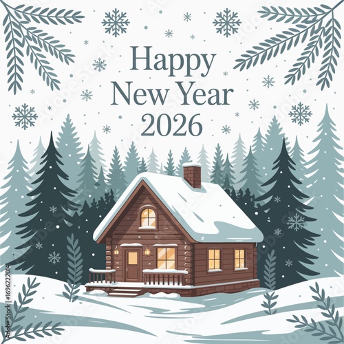 Naklejka premium Winter cabin in snowy forest with Happy New Year 2026 text log cabin