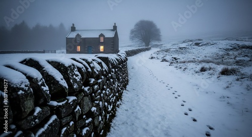 © NE97, Naklejka premium Winter cabin retreat. Snowy landscape with a cozy stone house. Ideal for holiday cards, travel blog or Christmas designs. Rural tranquility, snowy escape concepts.