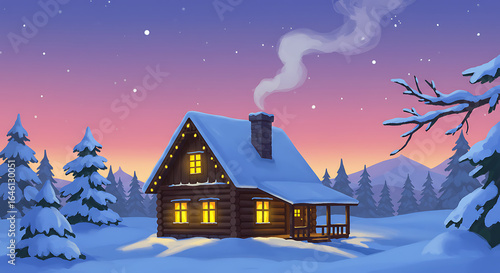 Naklejka premium Winter Cabin Scene with Snow Covered Trees and Cozy Lights
