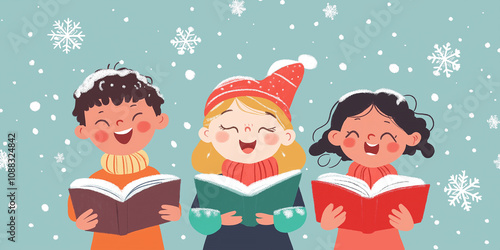 Naklejka premium Winter Choir: Kids Caroling in a Snowy Scene