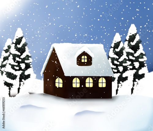 © BettyManlika, Naklejka premium winter christmas house and tree at night, background winter