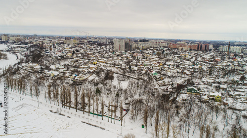 © Bas, Obraz premium winter city pano with lot of houses and snow showed from drone , aerial photo