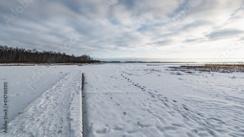 © andrey_iv, Obraz premium Winter clouds over the forest lake