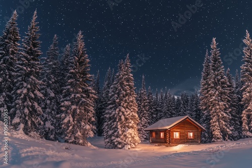 © Dina, Naklejka premium winter cottage core - small wooden rustic cabin with tin roof, surrounded by tall, snow-covered fir trees under a starry sky, minimal background with copy space