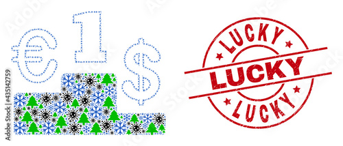 Obraz premium Winter Covid-2019 collage currency pedestal, and textured Lucky red round stamp print. Collage currency pedestal is constructed of Covid, fir-tree, and snow items.