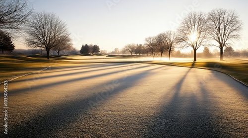Fototapeta premium Winter dawn with frosted grass, morning mist on a peaceful golf course, golden light casting long shadows