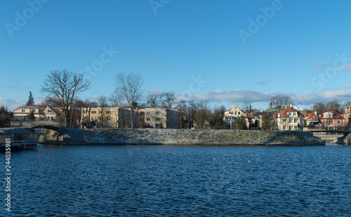 Fototapeta premium Winter day landscape by the lake with trees on a sunny and snowy day