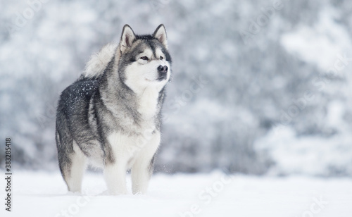 © Happy monkey, Naklejka premium winter dog alaskan malamute in the snow