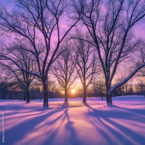 © Sekai, Fototapeta premium Winter Evening Glow: A Park at Dusk Illuminated by the Last Rays of Sun