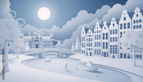 © Sergio, Obraz premium Winter fairytale of Amsterdam: paper boat on canal and windmill