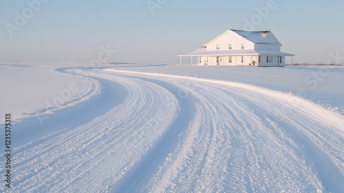 Obraz premium Winter farmhouse, snow road, serene landscape, peaceful scene