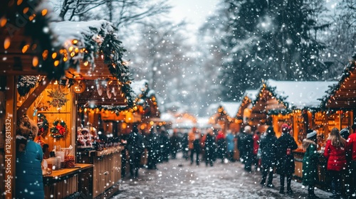 © Mazayshop, Obraz premium Winter festival with people drinking hot cider and snow falling - generated AI