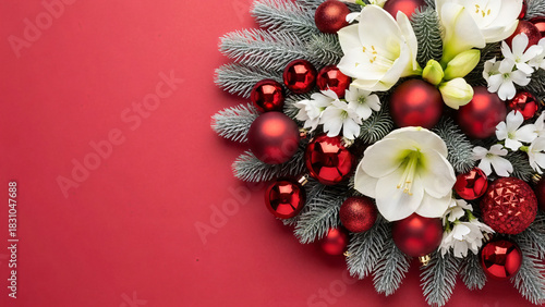 © lukman, Naklejka premium Winter Florals and Baubles Cluster on Crimson Surface