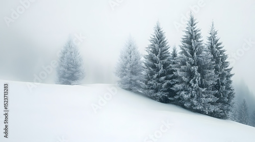 Fototapeta premium Winter foggy landscape with pine trees nature scene snowy environment serene...