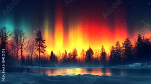 © Andik, Obraz premium Winter Forest Aurora Borealis Night Sky Landscape