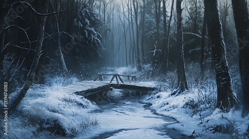 Naklejka premium Winter Forest Background with Snowy Wooden Bridge