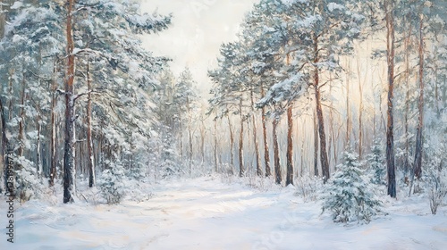 Naklejka premium winter forest covered in snow, tall pine trees, soft light filtering through...
