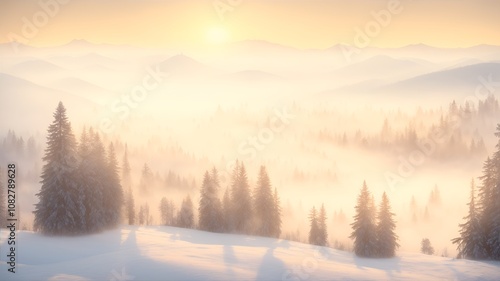 Naklejka premium Winter forest in the morning during sunrise, sunlight penetrates the fog, warm colors, AI generation