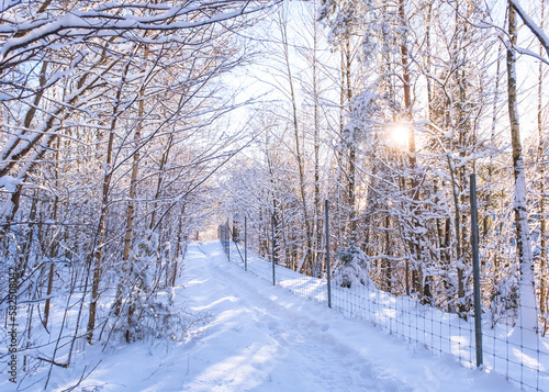 © joisbalu, Fototapeta premium winter forest in the snow with a fence gaurding wild life