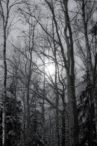 Fototapeta premium Winter forest. Pale sun shines through the trees