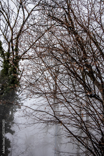 © Yuliia, Fototapeta premium Winter forest snow landscape. Trees and forest path covered with snow. Wild forest mushrooms and yellow tree leaves
