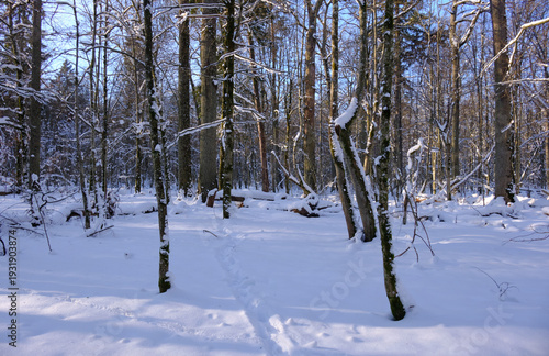 Fototapeta premium Winter forest trail with fresh snow and sunlight