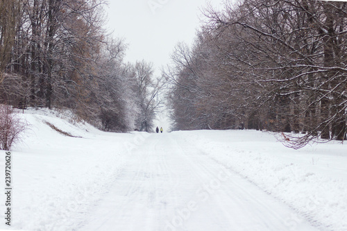 © 201122, Naklejka premium Winter forest, two people go along the snowy road