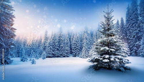 © l1gend, Fototapeta premium Winter forest with snow and christmas tree. 3d rendering.