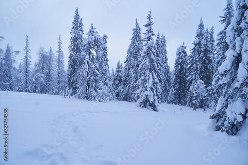 Fototapeta premium Winter forest with snow-covered fir trees high in the mountains. Sunny February day in the spruce forest. The trees are covered with snow to the top of their heads.