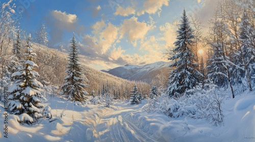 © Kamil, Naklejka premium Winter Forest with Snow-Covered Mountains and Blue Sky