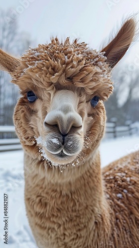 Obraz premium Winter fun with alpacas on the farm, Zabawa zimą z alpakami na farmie, alpaki