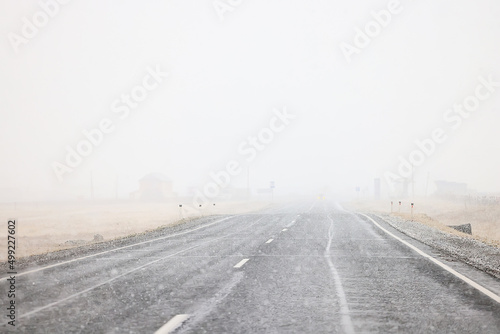 © kichigin19, Naklejka premium winter highway snowfall background fog poor visibility