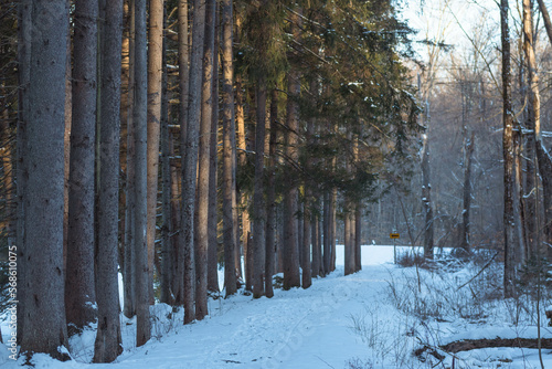 Naklejka premium Winter hiking trail, fresh snow in the woods