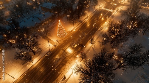 Naklejka premium Winter holiday celebration city street aerial view festive atmosphere evening lights christmas tree illuminated